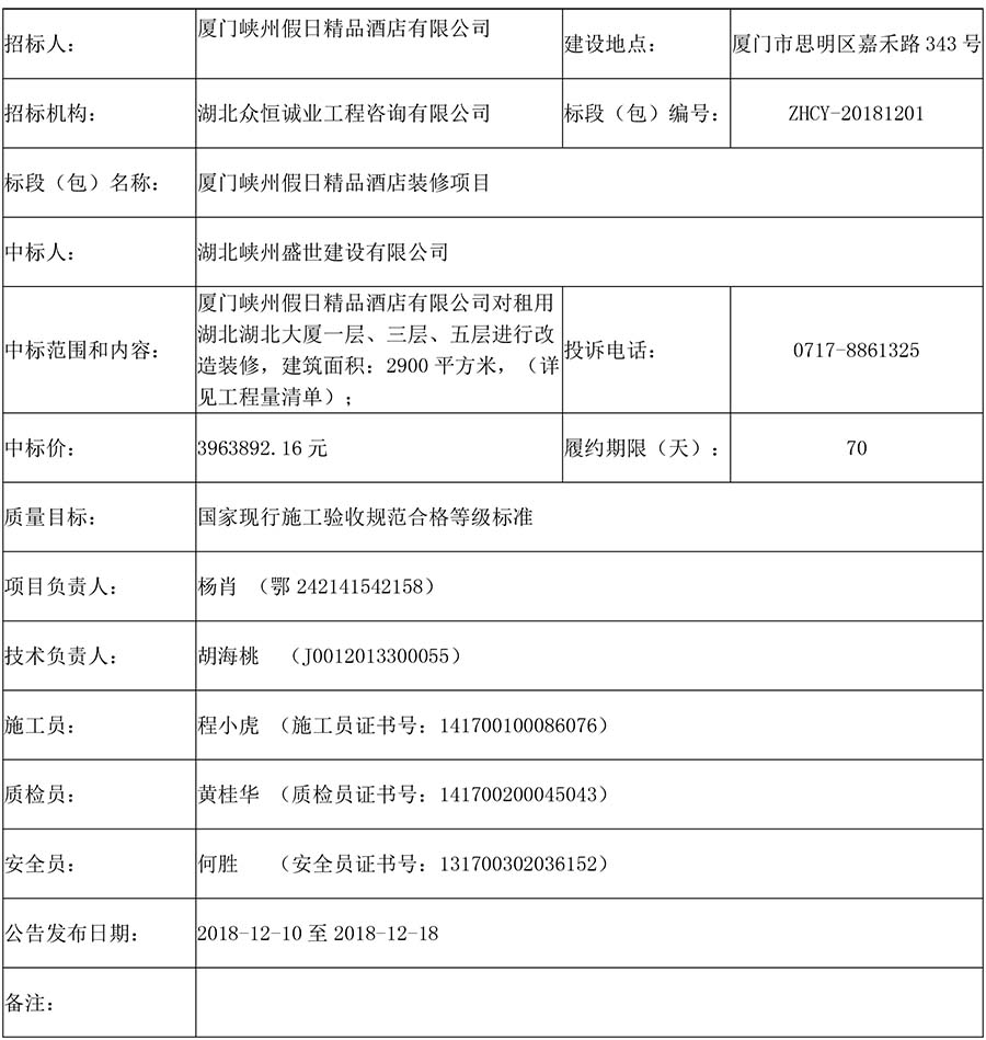 厦门峡州假日精品酒店装修项目中标结果公告