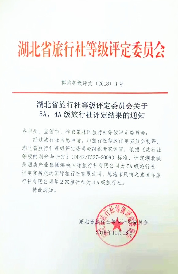 11月16日,湖北省文旅厅旅行社等级评定委员会正式行文公告,峡州集团海峡国际旅行社获评5A级旅行社。5A级旅行社是旅行社行业的国家级最高标准。目前我市130余家旅行社中,仅5家旅行社获此殊荣。